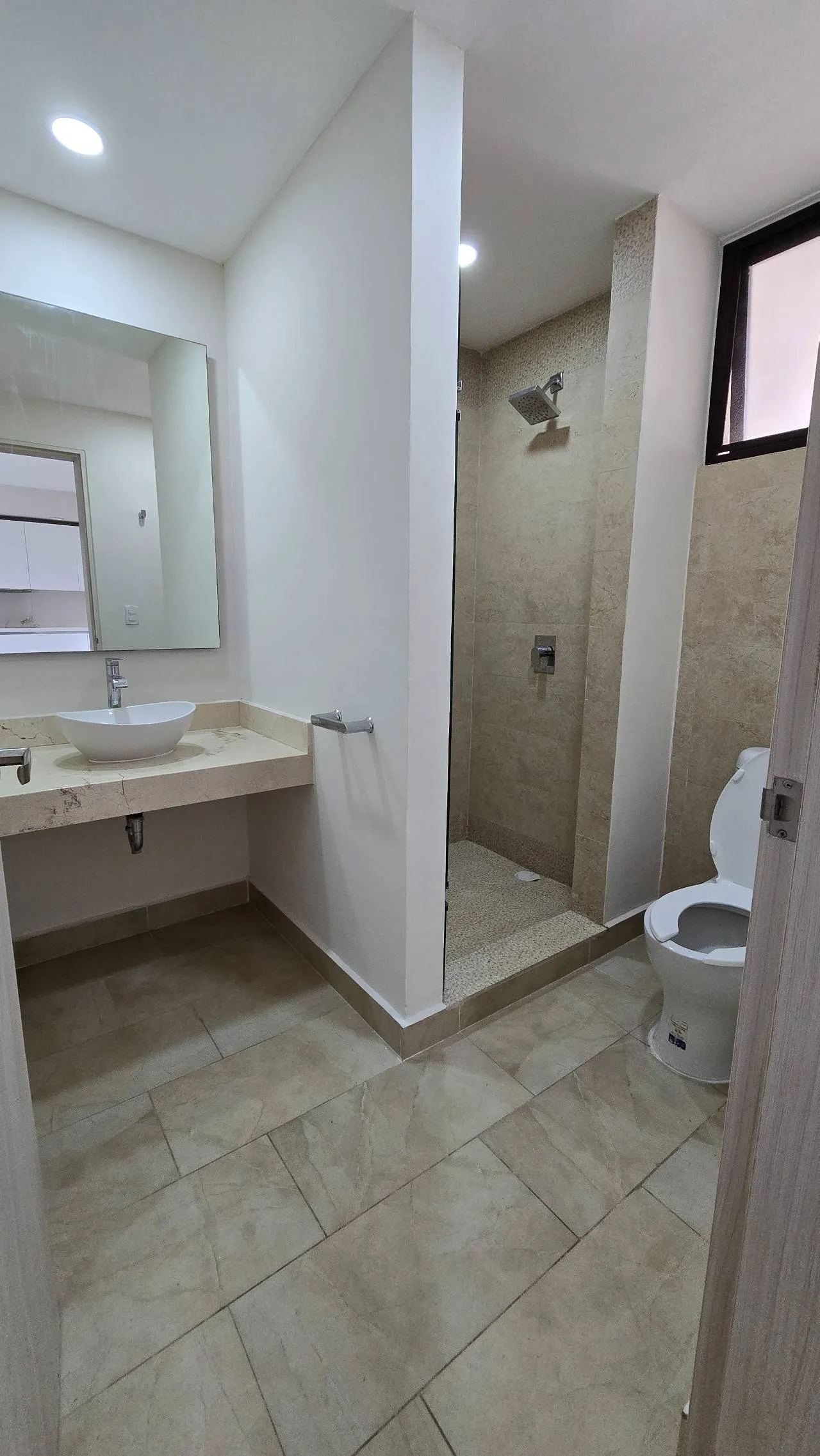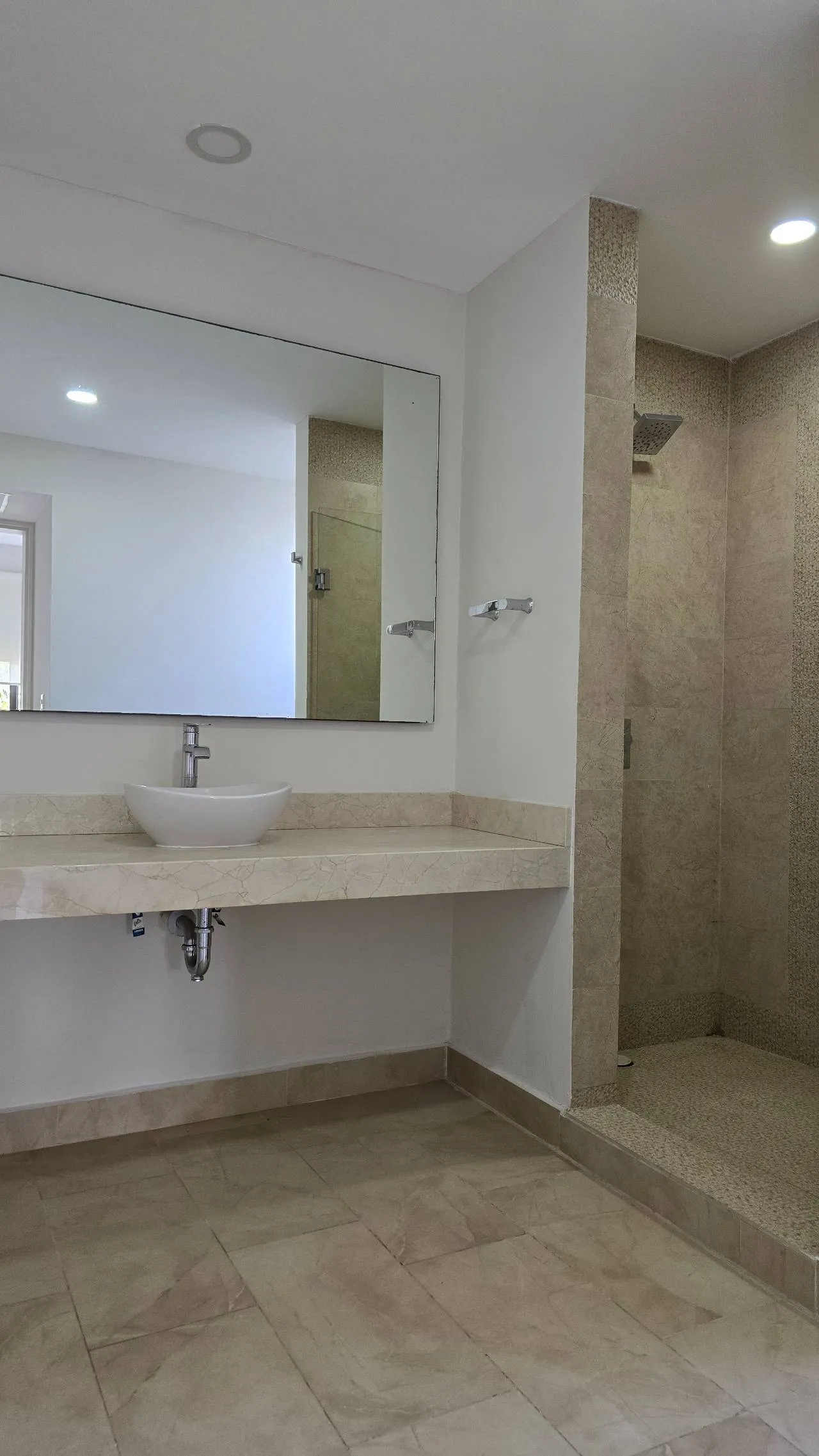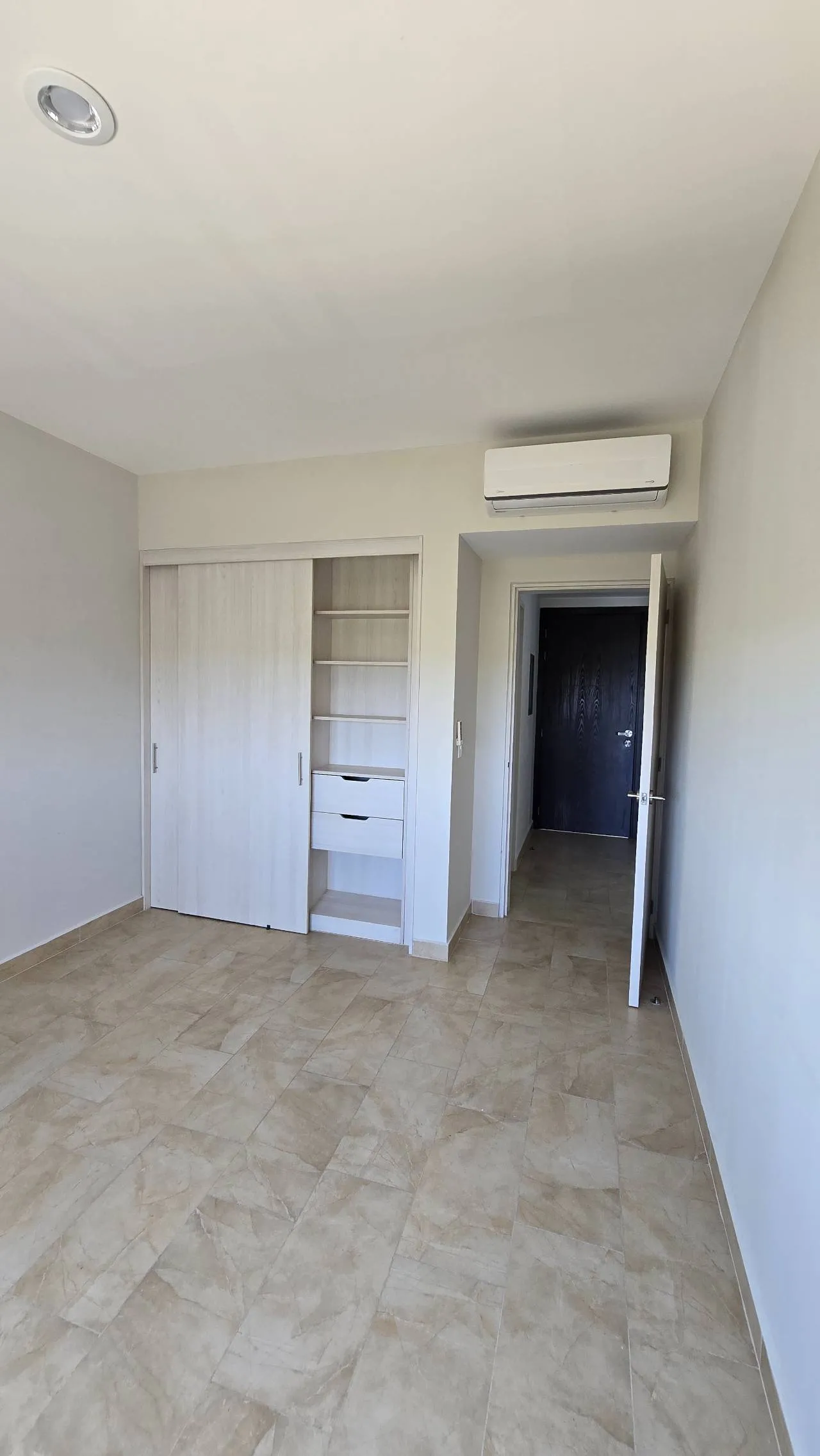 This apartment offers 2 bedrooms with closets, 2 full bathrooms, a kitchen equipped with a stove, range hood and electric oven, a spacious living-dining room, a terrace, a laundry area, an electric water heater, inverter air conditioners (low consumption), blinds and mosquito nets on all windows.
